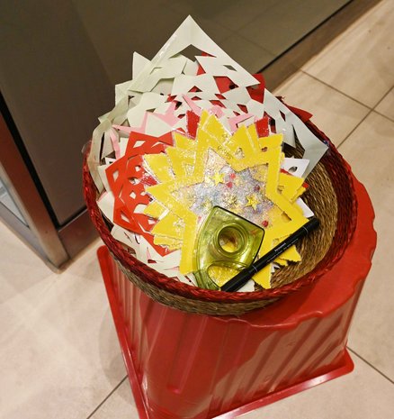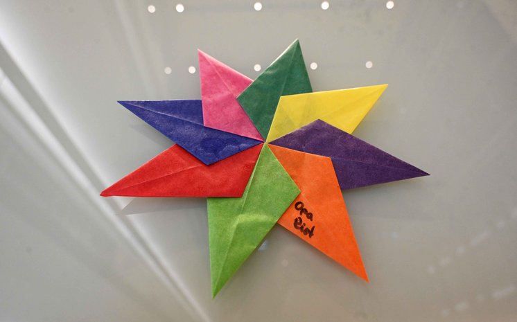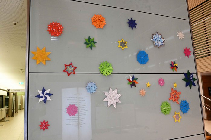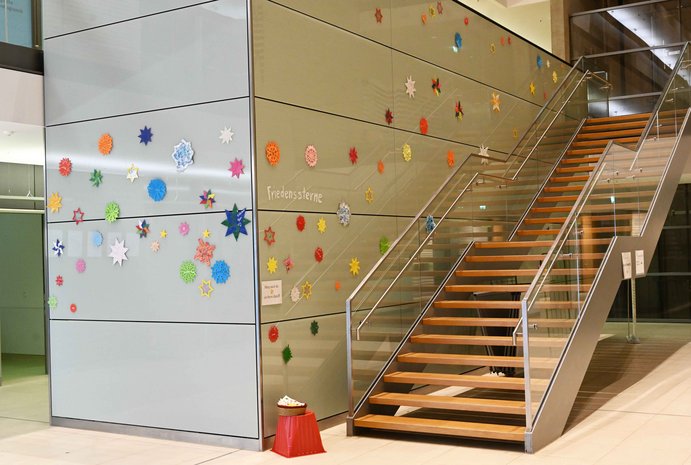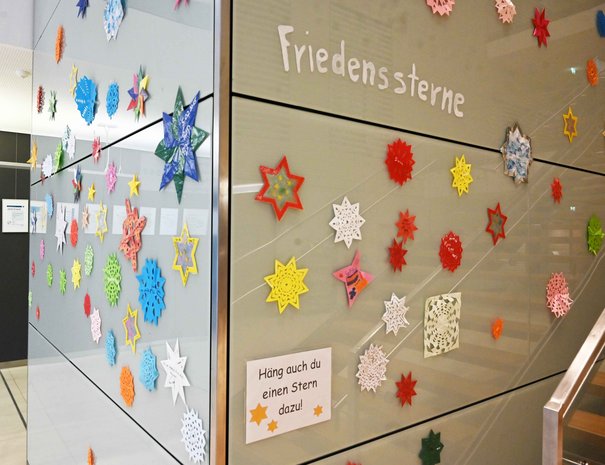 Es glitzert und funkelt in allen Farben, wenn man derzeit die Treppe an der Aula des Ravensburger St. Elisabethen-Klinikums hinauf- und heruntersteigt. Fast wie in einem Planetarium, nur bunter. Überall hängen Friedenssterne an der Wand, und täglich werden es mehr, Tesa, Schere und Bastelsachen laden alle kleinen und großen Patientinnen und Patienten, Angehörige und Besucher zum Mitmachen ein, und viele machen begeistert mit.