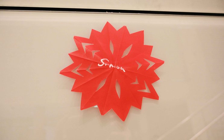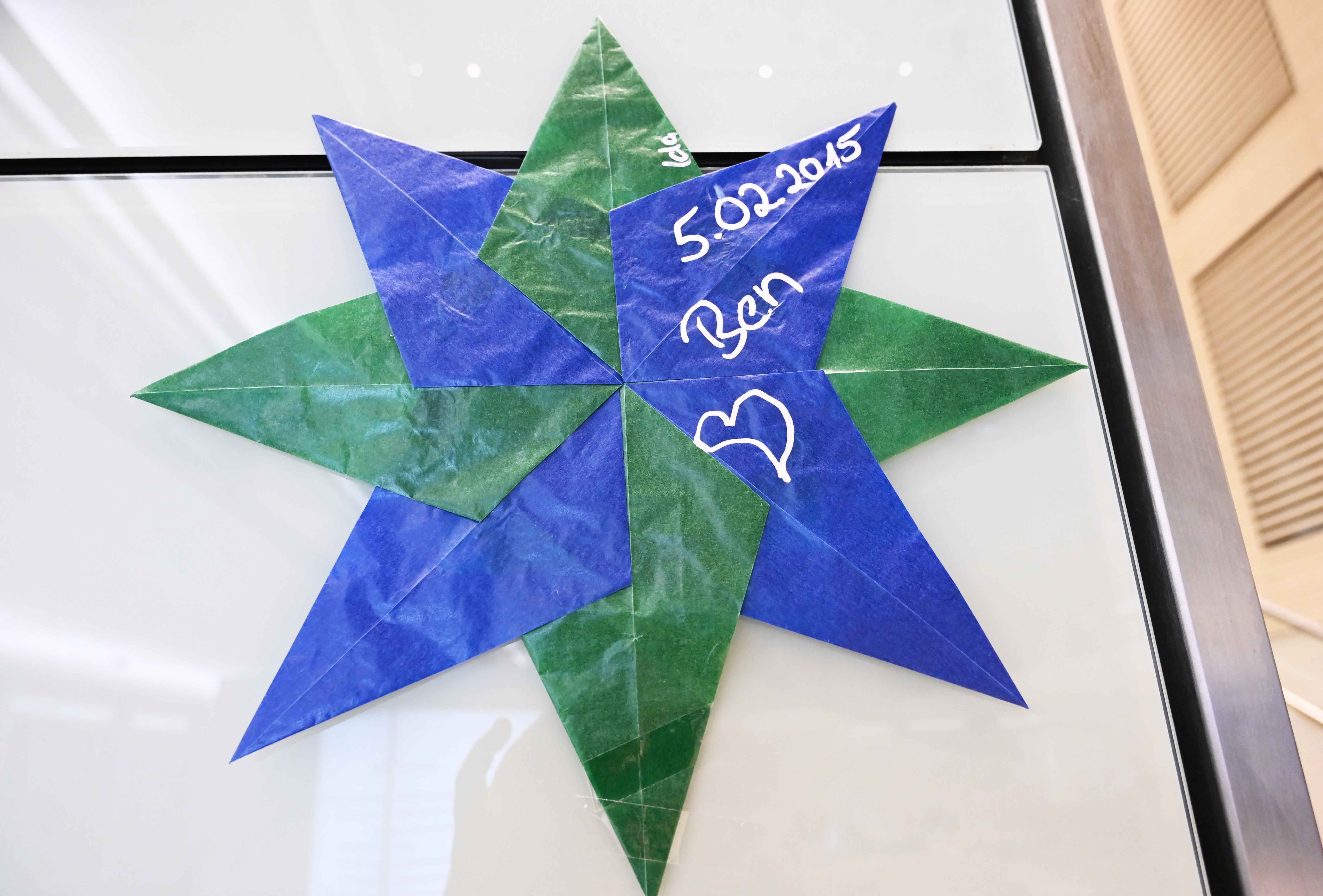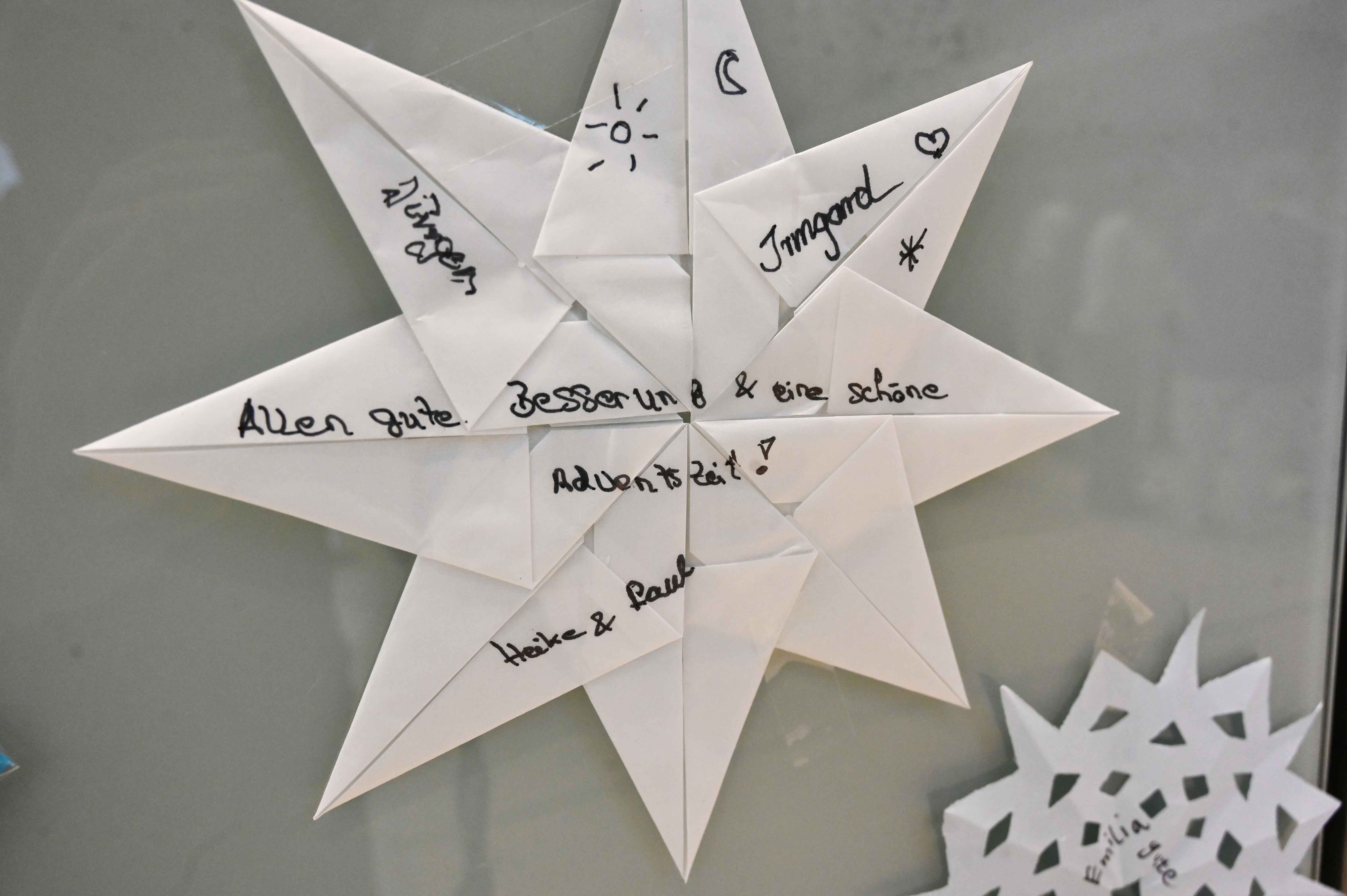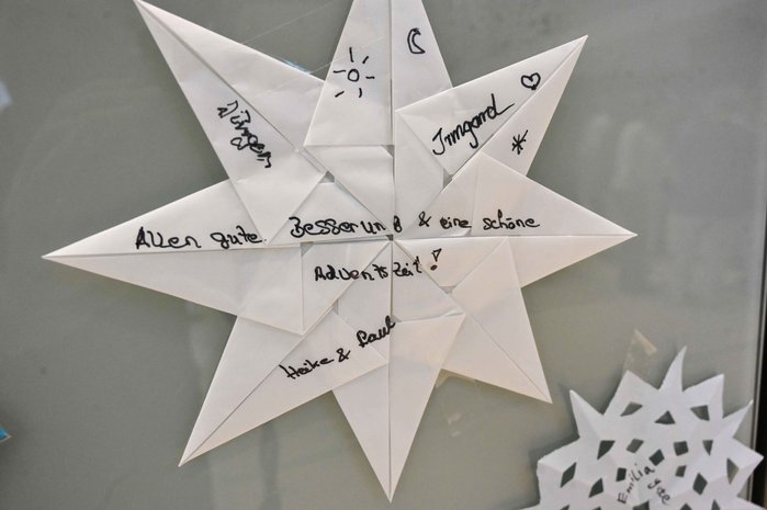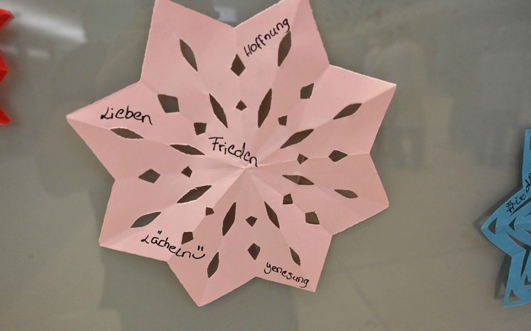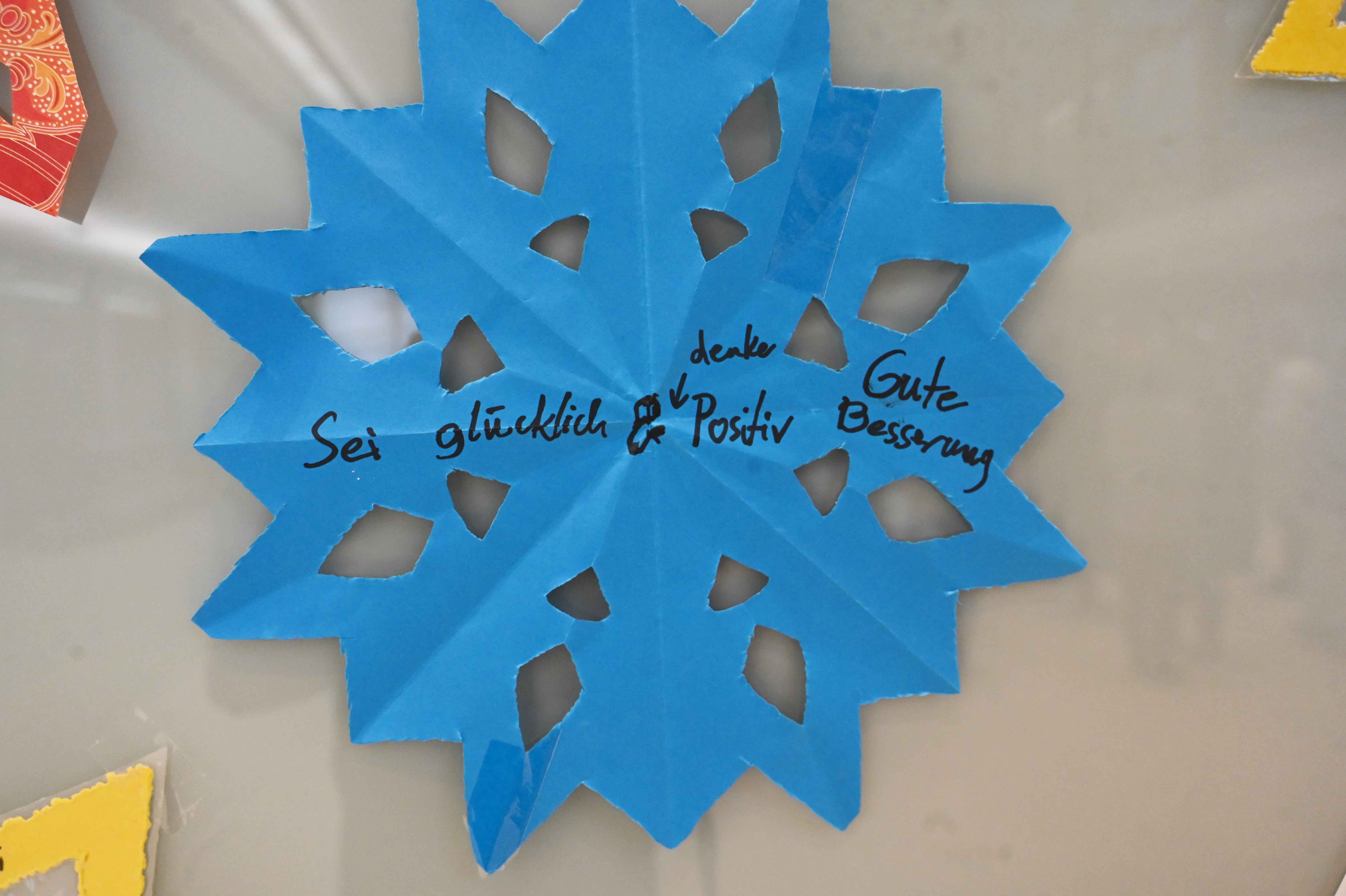 Auf einen Stern hat ein Kind „Sei glücklich, denk positiv. Gute Besserung“ geschrieben. Auch auf dem Nachbarstern stehen Worte, die den erkrankten Mitmenschen in dieser immer hektischer werdenden Welt helfen sollen: „Liebe. Vertrauen. Zuversicht. Optimismus. Dankbarkeit. Lebensfreude. Glaube. Hoffnung.“ Kürzlich war ein Kindergarten zu Gast, der gleich ein ganzes Sternbild bastelte.