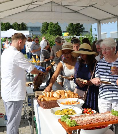Bei bestem Wetter und Musik der Wangener Gruppe "Earlybirds" war die Stimmung bei den rund 500 Gästen bestens. Das Team aus Küche und Cafeteria unter Leitung von Volker Jung trug mit Essen und Getränken das Seine zu einer Veranstaltung bei, von der am Ende alle begeistert waren. Und alle waren angesichts der strahlenden Sonne und der lauen Sommernacht froh darüber, dass man im Freien feiern konnte. Geschäftsführer Dr. Sebastian Wolf versprach denn auch eine Wiederholung an gleicher Stelle im kommenden Jahr. Dann hoffentlich bei gleichem Wetterglück. Getragen wurde die Feier von vielen aus den Reihen der OSK, die bei der Vorbereitung und Durchführung dem Abend das Gepräge einer großen Gartenparty gaben. Dies waren neben dem Küchenteam insbesondere Haustechnik und Hauswirtschaft, die Mitglieder des Betriebsrates bei der Bewirtung an den Ausgabestellen sowie Freiwillige aus allen Bereichen.