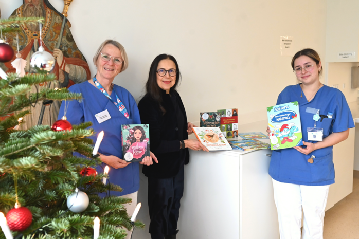 Freuen sich über die Buchspende (von links): Regina Borsutzky, Stationsleitung der Kinderstationen D31/32, Bettina Gretter vom Rotary Club Elementarbildung und Pflegefachkraft Luisa Koch. Stellvertretend sind einige der gespendeten Bücher zu sehen.