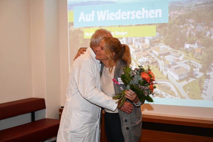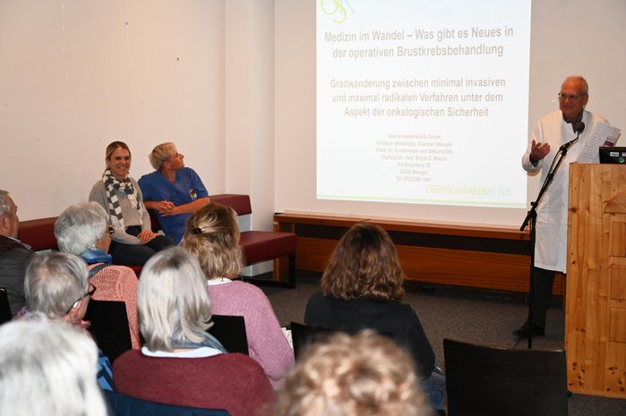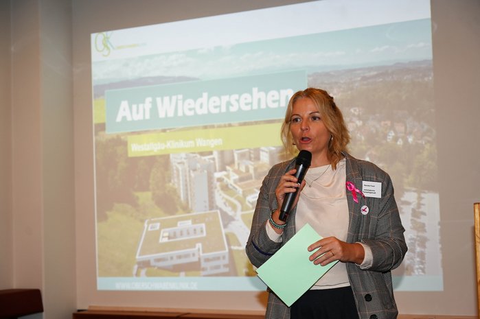 Medizinisch im Fokus stand die Strahlentherapie, die Patientinnen aus Wangen auch am St. Elisabethen-Klinikum in Ravensburg absolvieren können. Mit dem EK unterhält das Westallgäu-Klinikum seit mehr als zwei Jahrzehnten ein gemeinsames, zertifiziertes Brustzentrum, in dem Frauen nach höchsten medizinischen Standards und neuesten wissenschaftlichen Erkenntnissen interdisziplinär behandelt werden. „Die Medizin hat in der Brustkrebs-Therapie rasante Fortschritte erzielt: War vor 40 Jahren noch die Mastektomie, die Entfernung der Brust, Standard bei der OP, ist inzwischen in drei Viertel aller Fälle eine brusterhaltende Therapie möglich“, erläuterte Dr. Mauch. Der Chefarzt sprach alle gängigen Formen moderner Therapie an – von antihormonellen bis zielgerichteten Therapien, etwa Antikörper- und Immuntherapien – und berichtete auch über die Fortschritte bei onkoplastischen Operationen und Rekonstruktionen.
