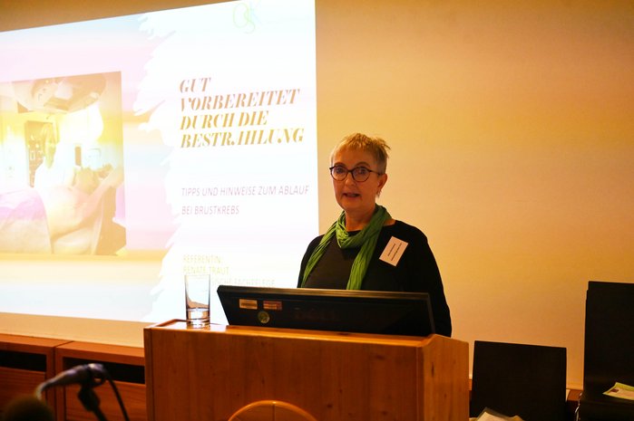 Dass das Risiko, an Brustkrebs zu sterben, immer geringer wird, liegt auch an der Strahlentherapie. „Durch die Bestrahlung nach der Operation werden verbliebene Krebszellen zerstört und das Rückfallrisiko gesenkt“, sagte Renate Traut, die den Behandlungsverlauf dezidiert beschrieb. In der Regel beginnt die Therapie sechs Wochen nach der OP und/oder drei Wochen nach Ende der Chemotherapie. In täglichen, 15-Minuten langen Sitzungen – die reine Bestrahlung dauert dabei nur zwei Minuten – wird die DNA der Krebszellen zerstört. Dabei wird nur jener Bereich millimeterexakt bestrahlt, der erkrankt ist oder erkrankt sein könnte. Strahlentherapie ist dank der CT-Aufnahmen, dank futuristischer Physik und Medizintechnik inzwischen so sicher wie Raumfahrttechnik. Zuweilen auftretende Nebenwirkungen wie Rötungen und Brennen sind lästig, können aber gelindert werden. Das Brustzentrum weiß auch hier Rat – mit seiner Krebsberatungsstelle, mit Psychoonkologischer Betreuung oder durch Fachpflegerinnen wie Renate Traut, die bereits hunderte Patientinnen betreut und passende Hautpflege- und Verhaltenstipps ebenso parat hat wie sämtliche Hilfsadressen für jedes individuelle Problem.